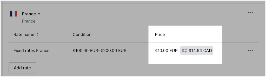 For example, you're a merchant with a primary market of Canada and have a large European market that you ship to. You can choose to set up and advertise localized shipping rates for the European market such as €15 flat rate shipping, or free shipping with a minimum €200 spend. For customers in the European market, the checkout displays those advertised shipping rates in their local currency.