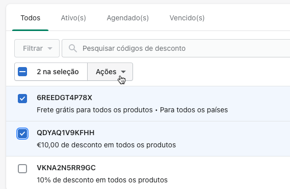 É possível desativar temporariamente vários descontos não expirados com uma ação em massa, por exemplo, no final da promoção ou quando você quiser mudar sua estratégia de marketing.
