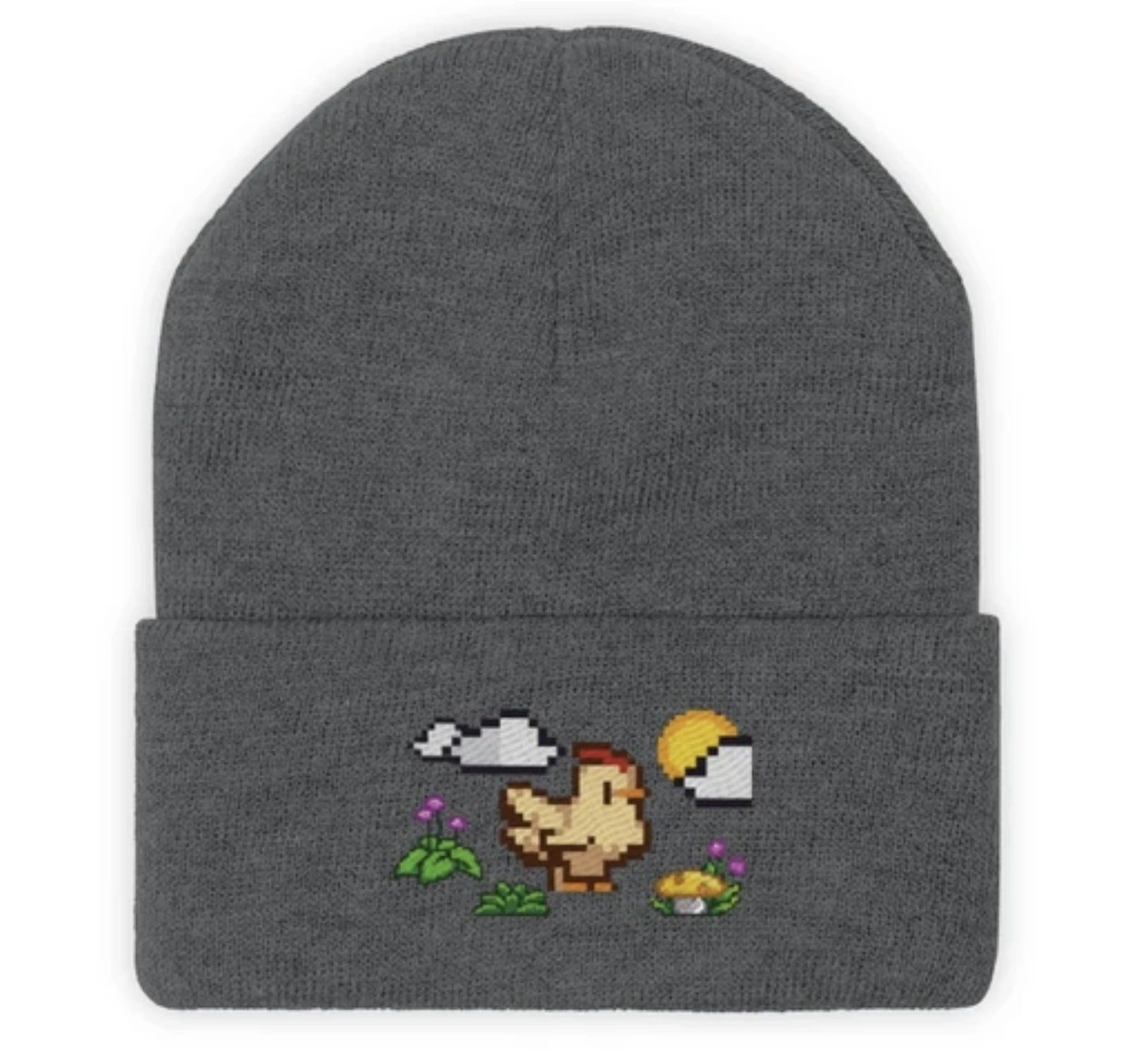 彼女のお気に入りの一つがこのピクセルチキンのニット帽で、配信時によく着用しています。
