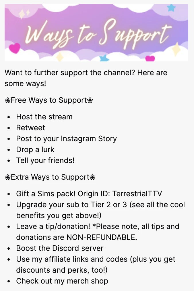 オリジナルグッズの宣伝は恥ずかしがらずに行いましょう。Twitchのファンは、サブスクリプションや寄付を通じてお気に入りのストリーマーをサポートすることが大好きです。グッズの販売も、彼らがあなたをサポートするための一つの手段なのです。