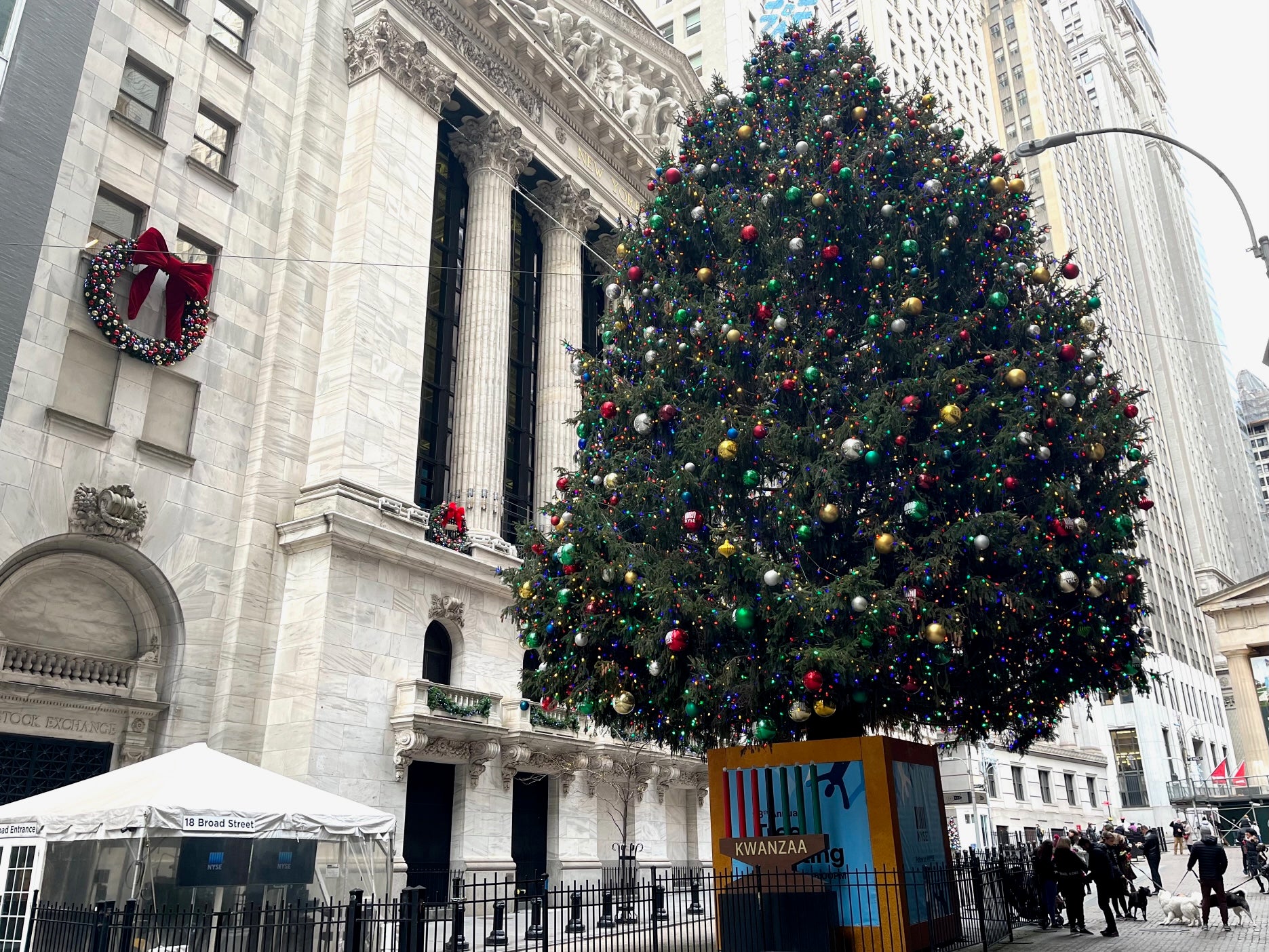 ニューヨーク証券取引所の前にある巨大ツリーは本物のもみの木を使用。