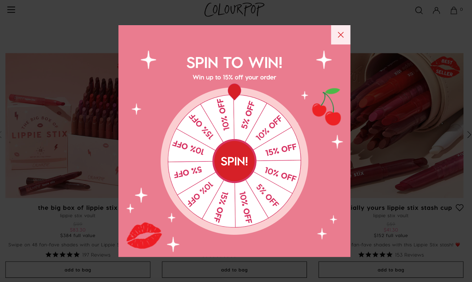 Colourpop’s Spin to Win pop-up on its homepage offers new visitors an interactive way to get a discount ranging from 5% to 15% off a purchase.