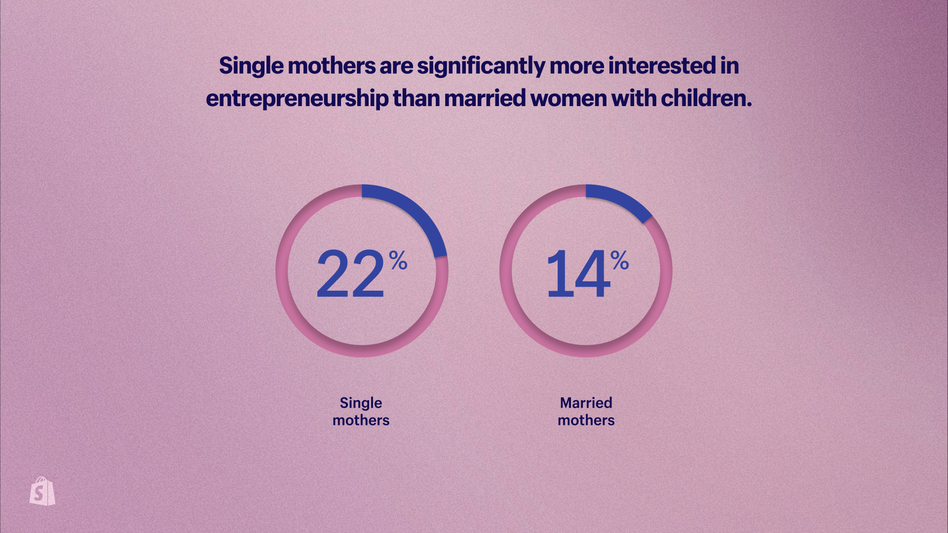 - 22% of single women with children said they are “very interested” in starting a business, compared to 14% of married women with children.