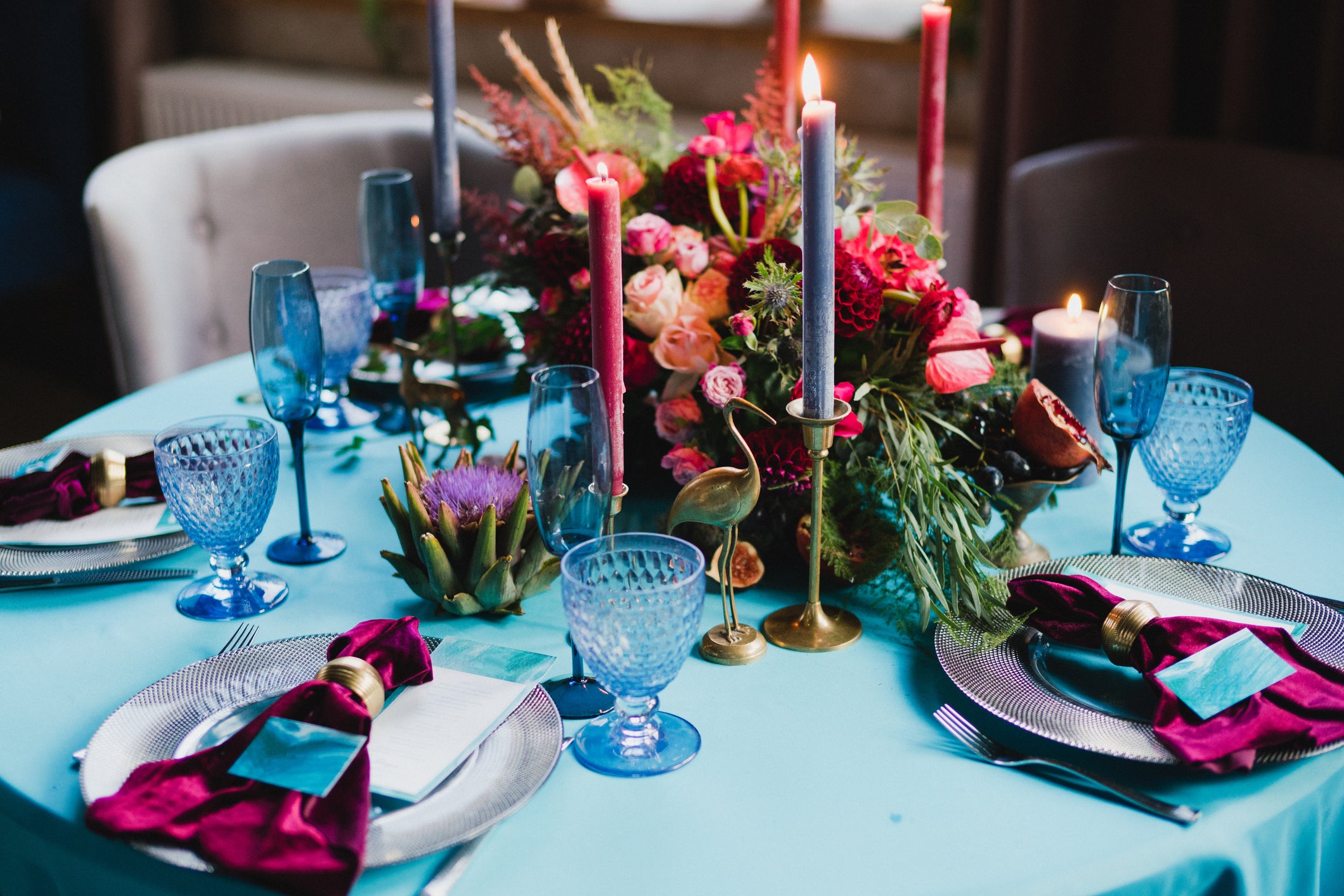 There are some items—unscented candles, guestbooks, linens, and florals, for example—that will always be in demand for weddings. What’s different for 2022 is that color palettes are changing. Soft hues are on their way out and jewel and earth tones are in—and couples want those basic items to match. Nicole-Natassha says that after two years of pushing back weddings, people are looking to make a splash with bold, bright colors—particularly with tapered candles, which match bright hues with lots of ambiance.