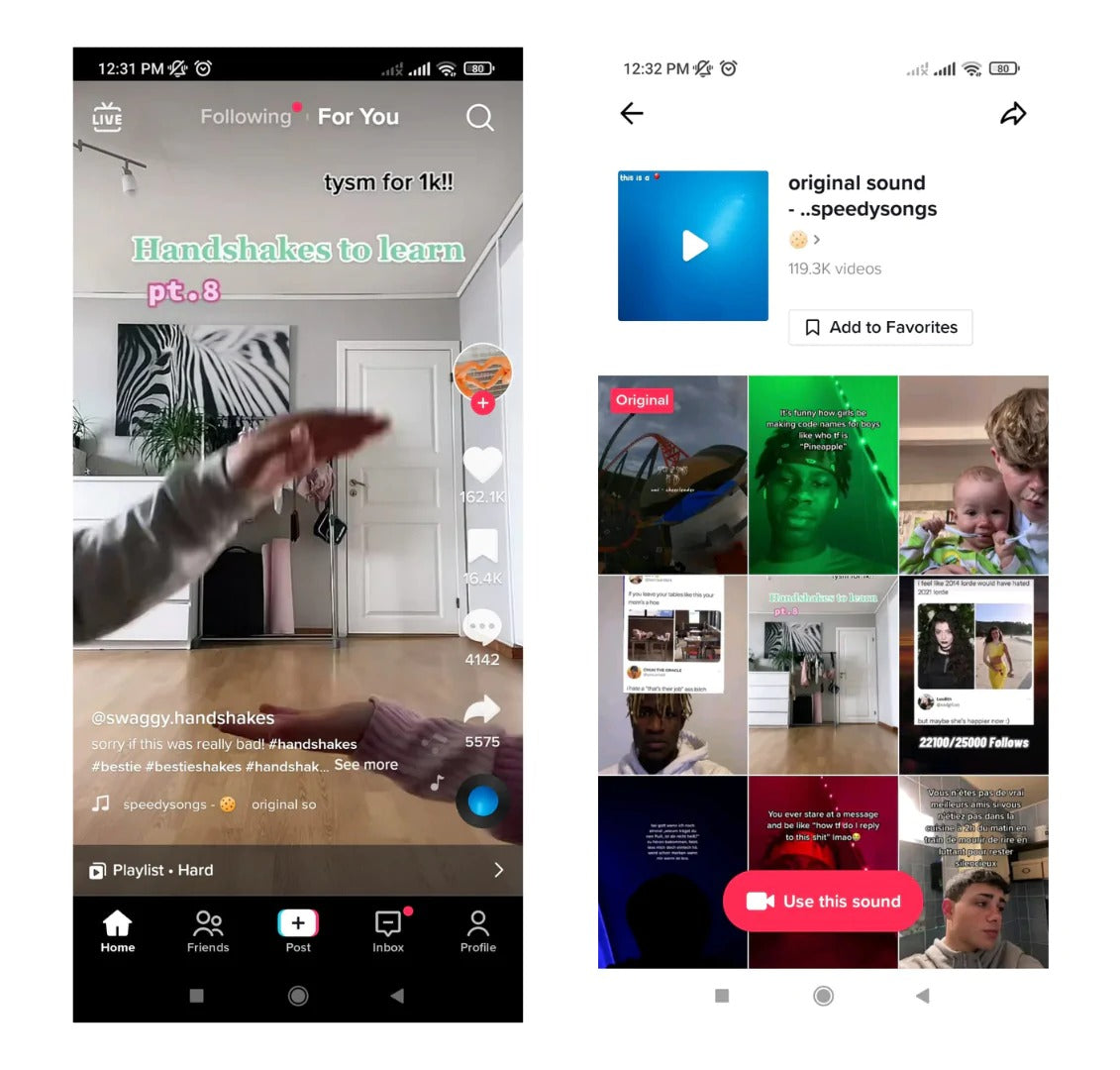 何より最高なのは、TikTokのクリエイターがトレンドのオーディオクリップを使用するのはとても簡単ということです。その曲を使用しているTikTok動画を選択し、クリップの名前(通常は投稿のキャプション下の音符アイコンの横に表示)をタップすれば、「このサウンドを使用する」というオプションが表示されます。