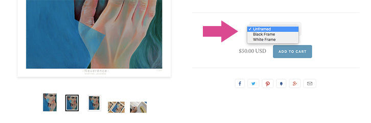 ポイント:Shopifyのバリエーション選択機能を使うと、サイズのオプションだけではなく、仕上げやフレームのオプションも提供できます。バリエーション設定では、単体価格やオプション込み価格を反映できます。