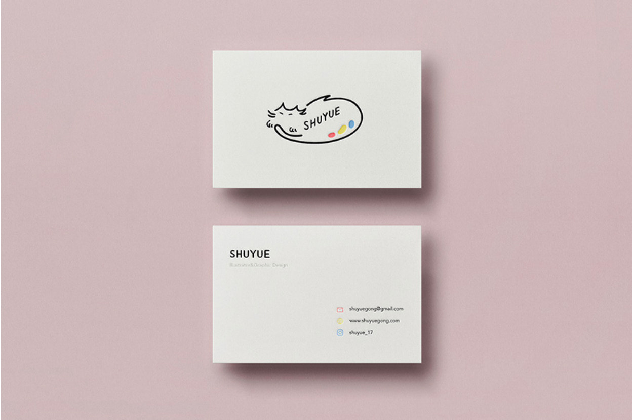 Shuyue opts fora simple business carddesign with just the logo on the front and three points of contact on the back—Instagram included. The addition of the Instagram logo lets recipients know what platform they can connect with Shuyue on.