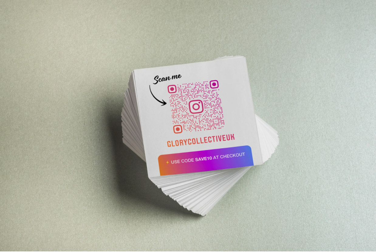 Glory Collective UKsimplifies its business cardsby addingjustan Instagram QR code. It adds an incentive at the bottom with the promise of a discount at checkout.