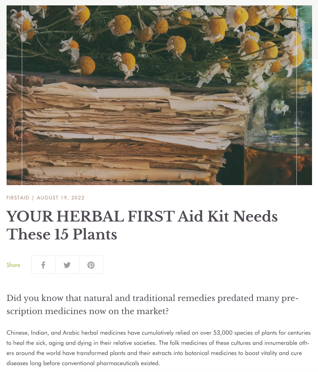 Online apothecaryAnima Mundi Herbals, for example, has a blog where it shares recipes, tips, and information about herbalism.This postrounds up the 15 plants you need to create your at-home first-aid kit.