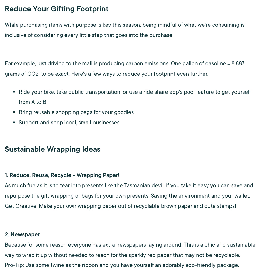The post also includes other tips for more sustainable gift giving likely to be of interest to its audience.