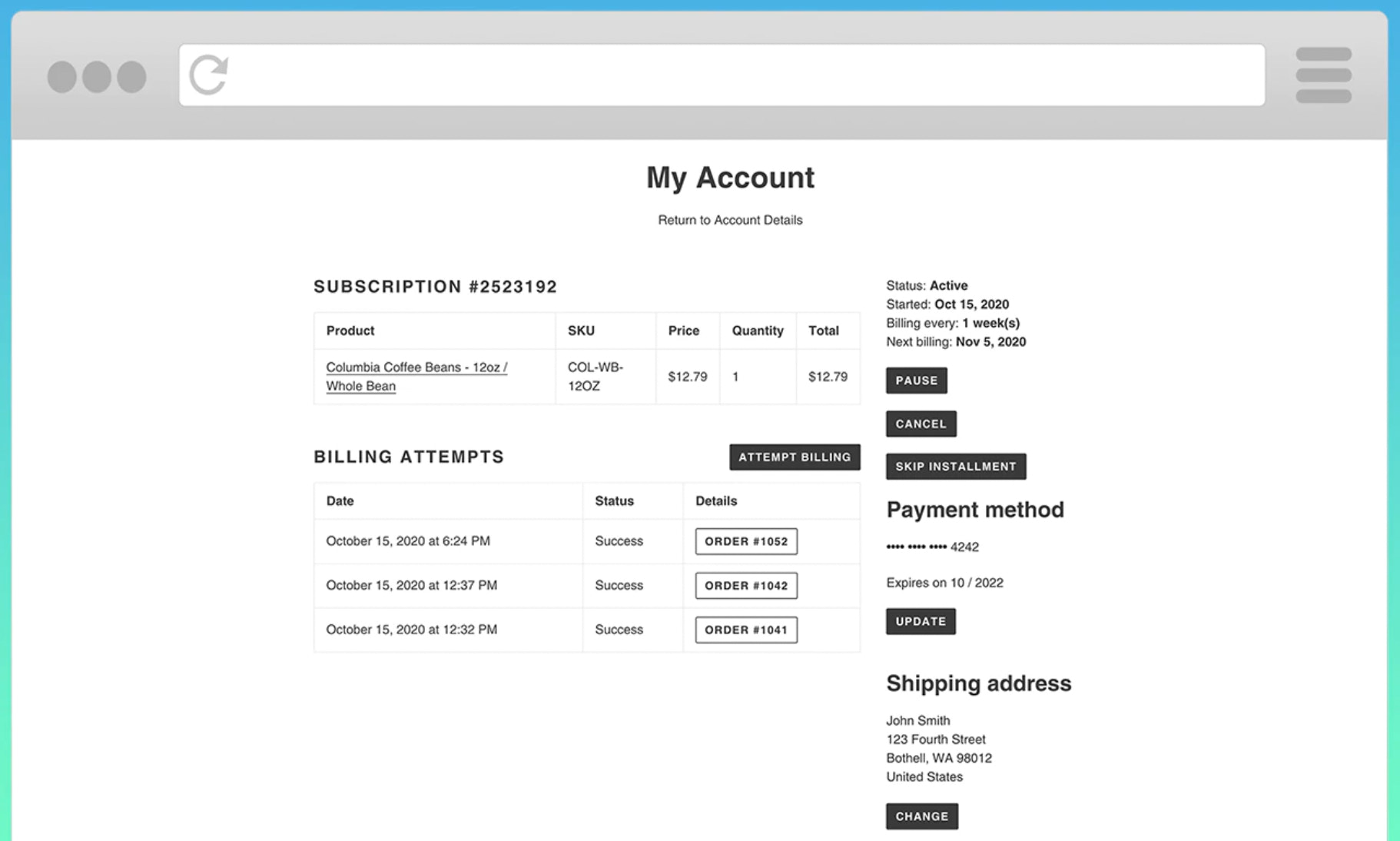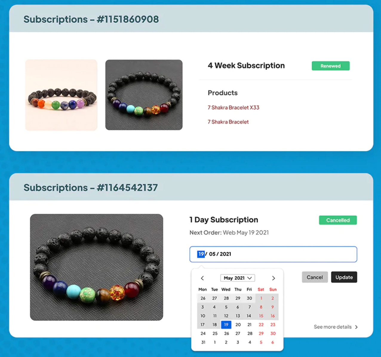 - Flexible order management for customers.Customers can manage their orders within the subscription management portal making it easy to change the date they receive their next subscription