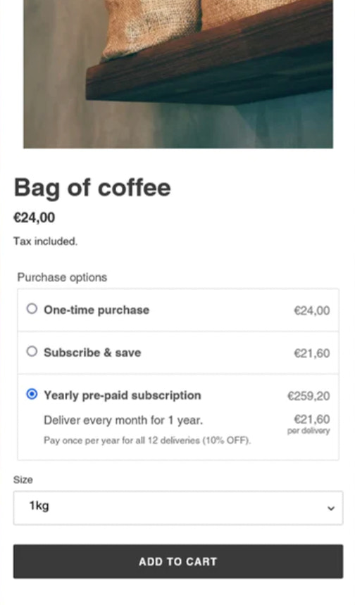 - Flexible subscription options. Offer advanced subscription options, such as maximum and minimum number of orders, variable discounts over time, pre-paid subscriptions, and create-a-box subscriptions