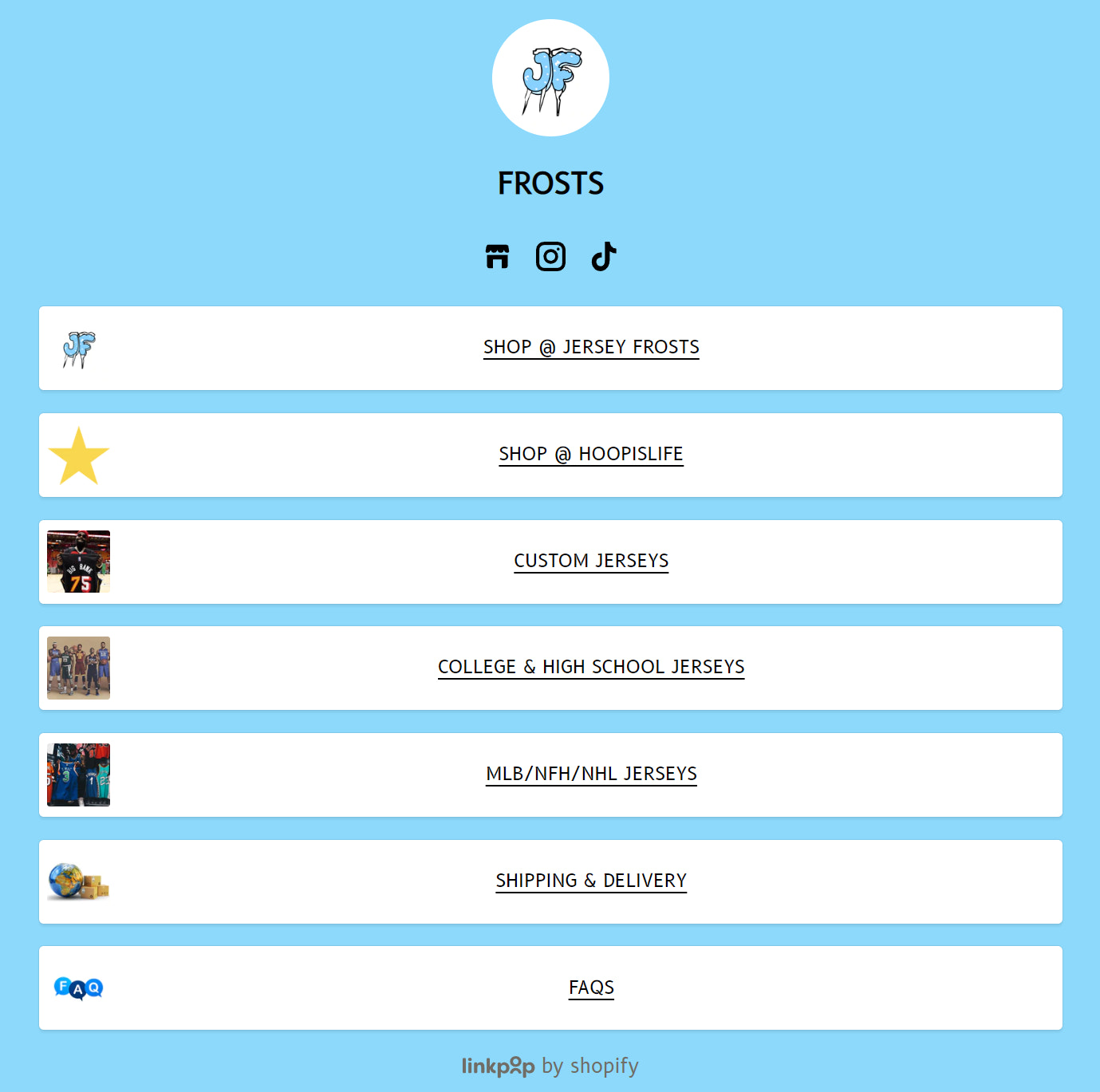 当你点击链接时,你会发现所有泽西弗罗斯特认为你会发现有价值的链接。这些链接包括到他们网站的一般链接,以及更具体的链接,比如他们的定制球衣,大学和高中的球衣,以及运输和交付信息。