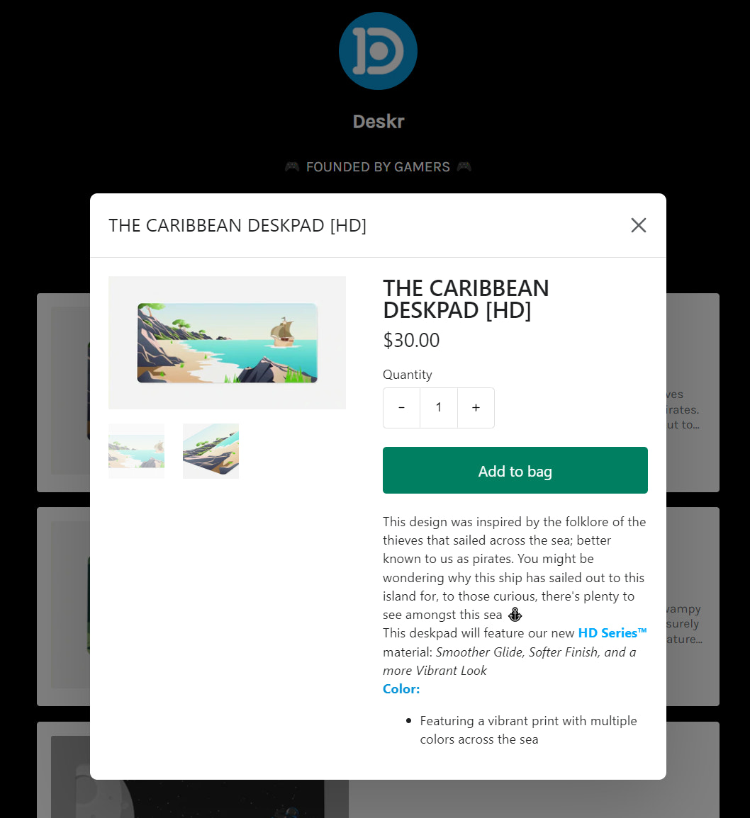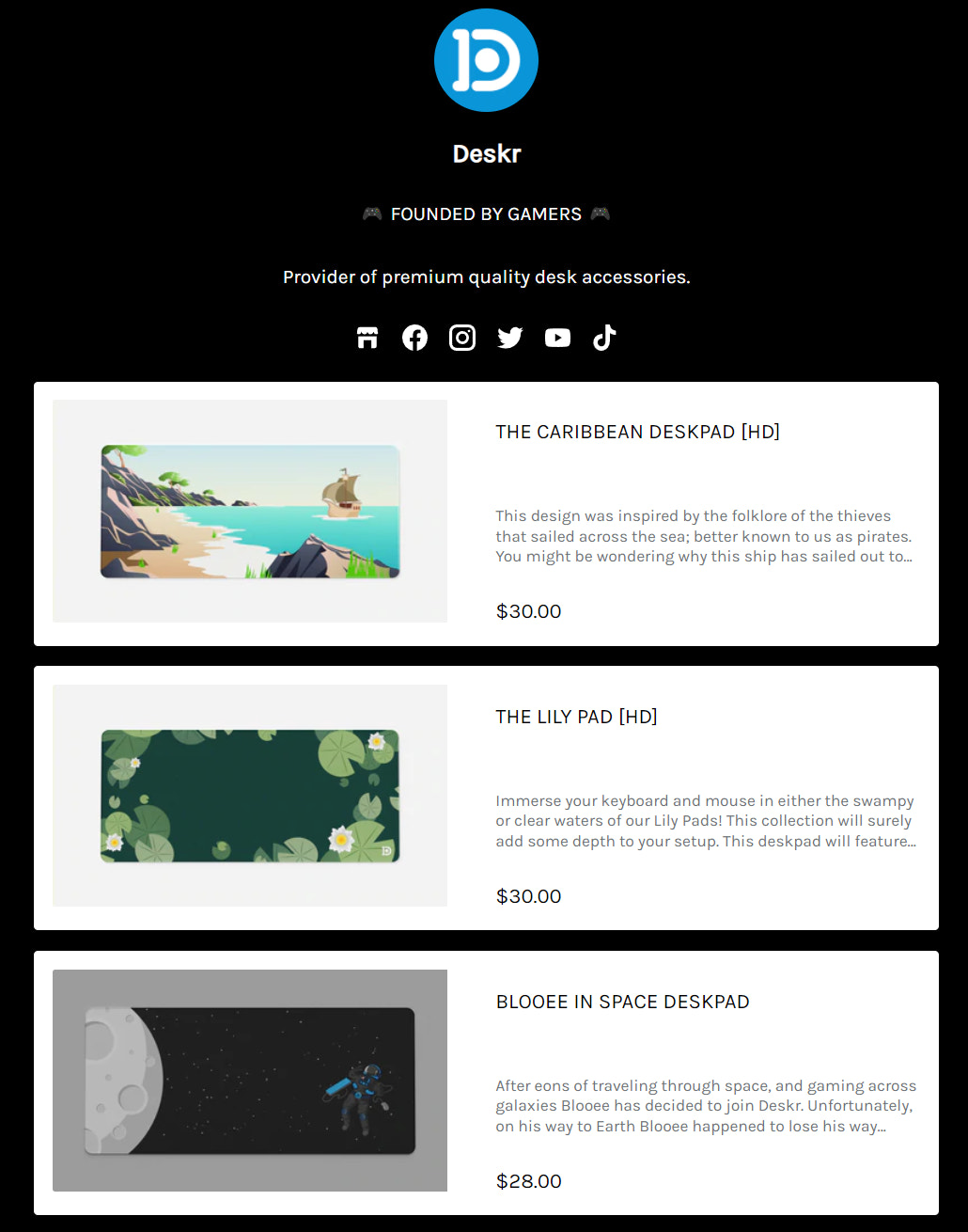 Shopify商店Deskr使用另一个很酷的Linkpop功能:直接链接到一个可购物的产品,完成一个产品照片,产品描述,价格.