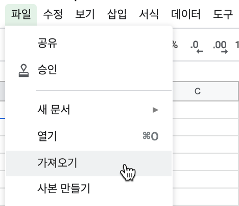 제목 없는 스프레드시트페이지에서파일>가져오기...로 이동합니다.
