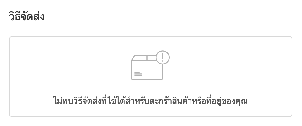 ลูกค้าที่ป้อนที่อยู่สำหรับจัดส่งในภูมิภาคที่ไม่ได้อยู่ในเขตการจัดส่งของคุณจะได้รับข้อความแจ้งว่าไม่มีอัตราค่าจัดส่งที่พร้อมให้บริการสำหรับภูมิภาคนั้น