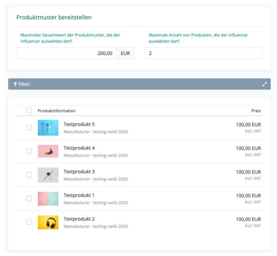 Zusätzlich legst du fest, welche, wieviele und bis zu welchem Wert du Produktmuster für diese Kampagne zur Verfügung stellst.