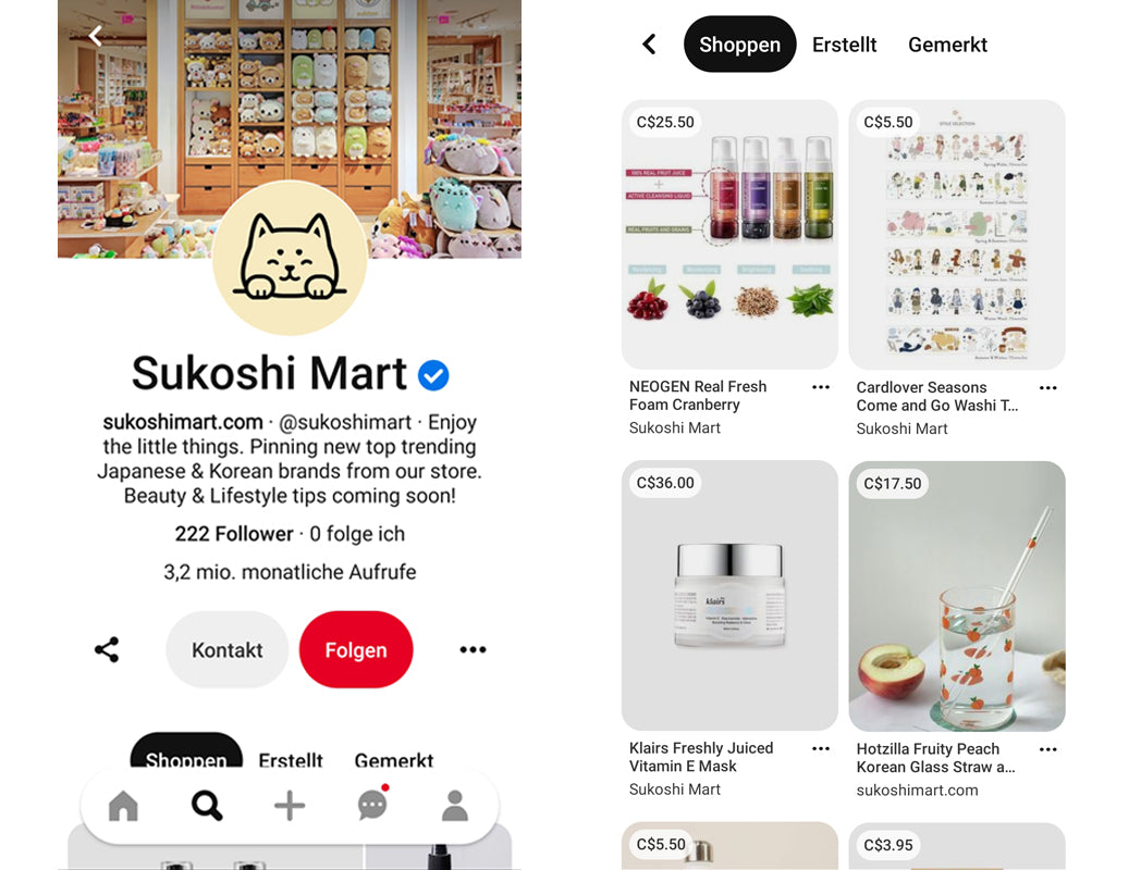 „Die Pinterest-Integration mit Shopify verschaffte uns Zugang zu einer neuen Zielgruppe, einschließlich einer unserer wichtigsten Demografien, der Generation Z. Wir luden unseren Produktkatalog auf Pinterest hoch und erstellten Produkt-Pins, die wir in Shopping-Werbeanzeigen verwandelten. Die Nutzung von Pinterest für unseren bestehenden Shopify-Katalog ermöglichte es uns, den Kunden stets aktuelle Preis- und Verfügbarkeitsinformationen auf einer brandneuen Plattform zu präsentieren. Mit Pinterest erzielten wir einen 3,5-fach höheren ROAS (Return on Ad Spend) als der Branchendurchschnitt in Kanada. Wir erreichen damit ein Publikum, von dem wir wissen, dass es von japanischen und koreanischen Beauty-Trends, Snacks und Lifestyle-Kultur inspiriert ist.“, Linda Dand, Gründerin von Sukoshi Mart.