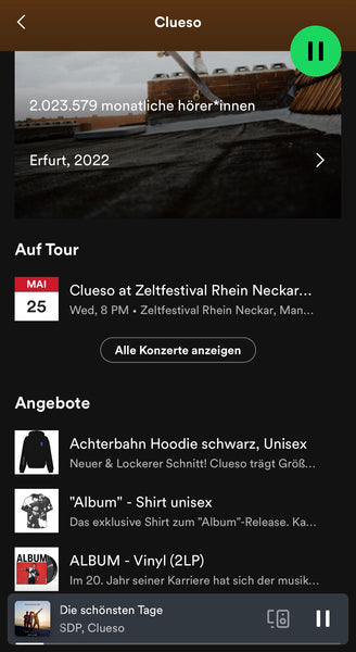 Drei, weil es auf Spotify primär um Musik geht und nicht ums Geschäft. Würdest du dein ganzes Merch-Portfolio präsentieren, wären deine Fans nicht unbedingt erfreut. Mit einer kleinen Auswahl allerdings bleibt dein Angebot exklusiv und holt Zuhörer:innen ganz natürlich in ihrer Begeisterung ab.