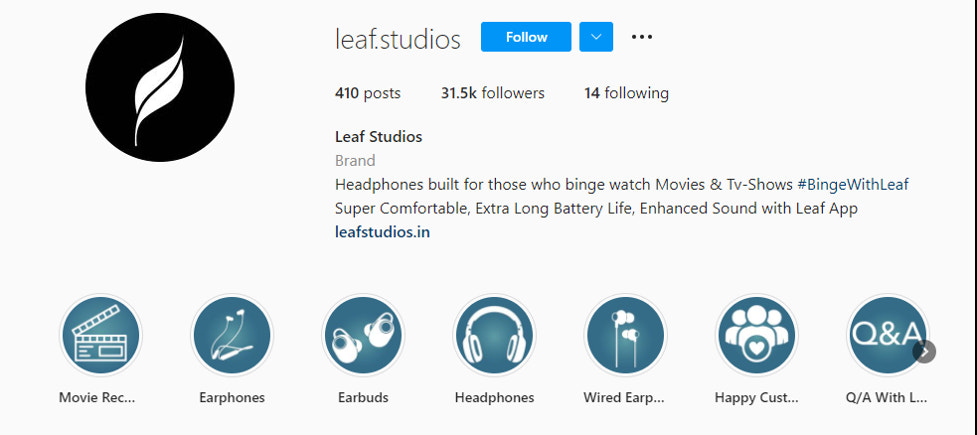 Leaf Studioshas a uniform, title-based approach to its Stories thumbnails, with blue backgrounds and striking white graphics. Its bio highlights what features their headphones have and their in-house app. A branded hashtag encourages social sharing and offers a chance to be featured. The website’s URL is also included for users who wish to browse more.