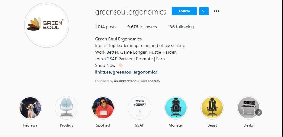 Green Soul Ergonomicsuses its Instagram bio to describe what it offers in terms of products, as well as the famous people using their products. Stories highlight the reviews of the customer as well. The link included in the bio is multi-purpose and gives you many options to browse products and collaborate with the brand.
