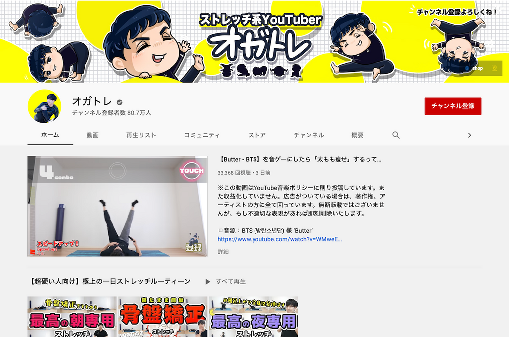「最高の体を作る毎朝の3分間ストレッチ」「座ってできる!体を柔らかくするストレッチ!「足首硬い人向け!体を柔らかくするストレッチ!」。目を引くタイトルと、丁寧な動画編集、「これなら自分にもできる」と思えるわかりやすい内容で「オガトレ」の視聴者は右肩上がりを続けます。そしてあるとき、「オガトレ」が大きく化ける日が訪れました。