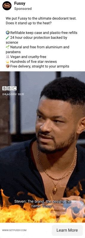 We’ve already touched on the power that influencers hold when marketing a business on Facebook. Include those influencer endorsements in your Facebook ad campaigns, like this example fromFussy, to build trust and credibility.